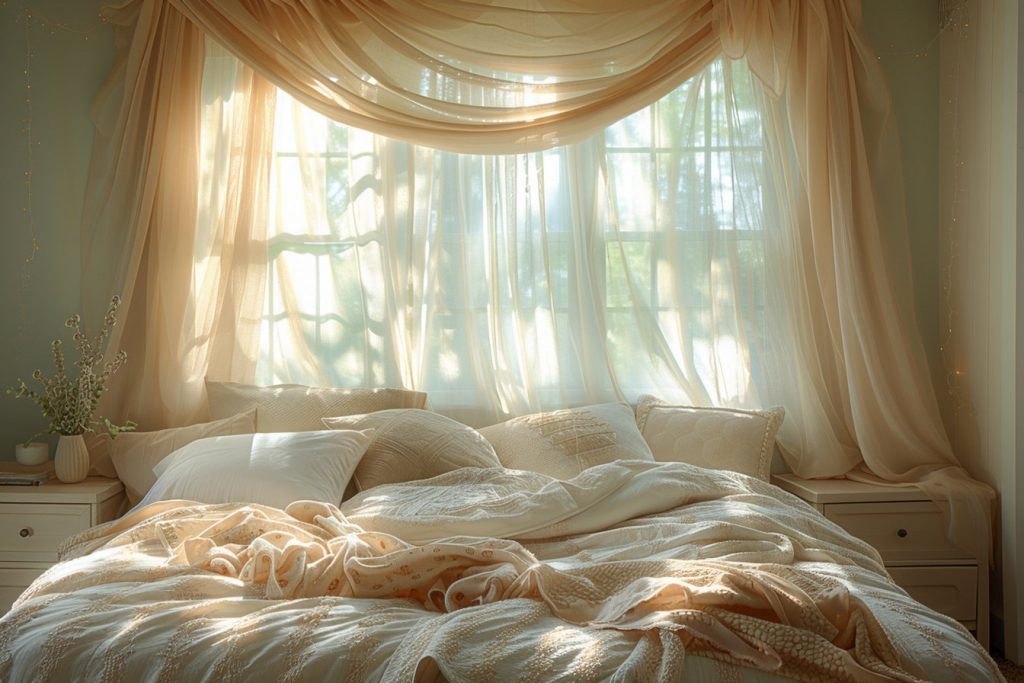 Utiliser un voile léger comme ciel de lit permet de créer une « zone de sommeil » distincte, séparée de l’aire de travail ou de détente. De plus, cela ajoute une touche élégante sans alourdir visuellement la pièce.